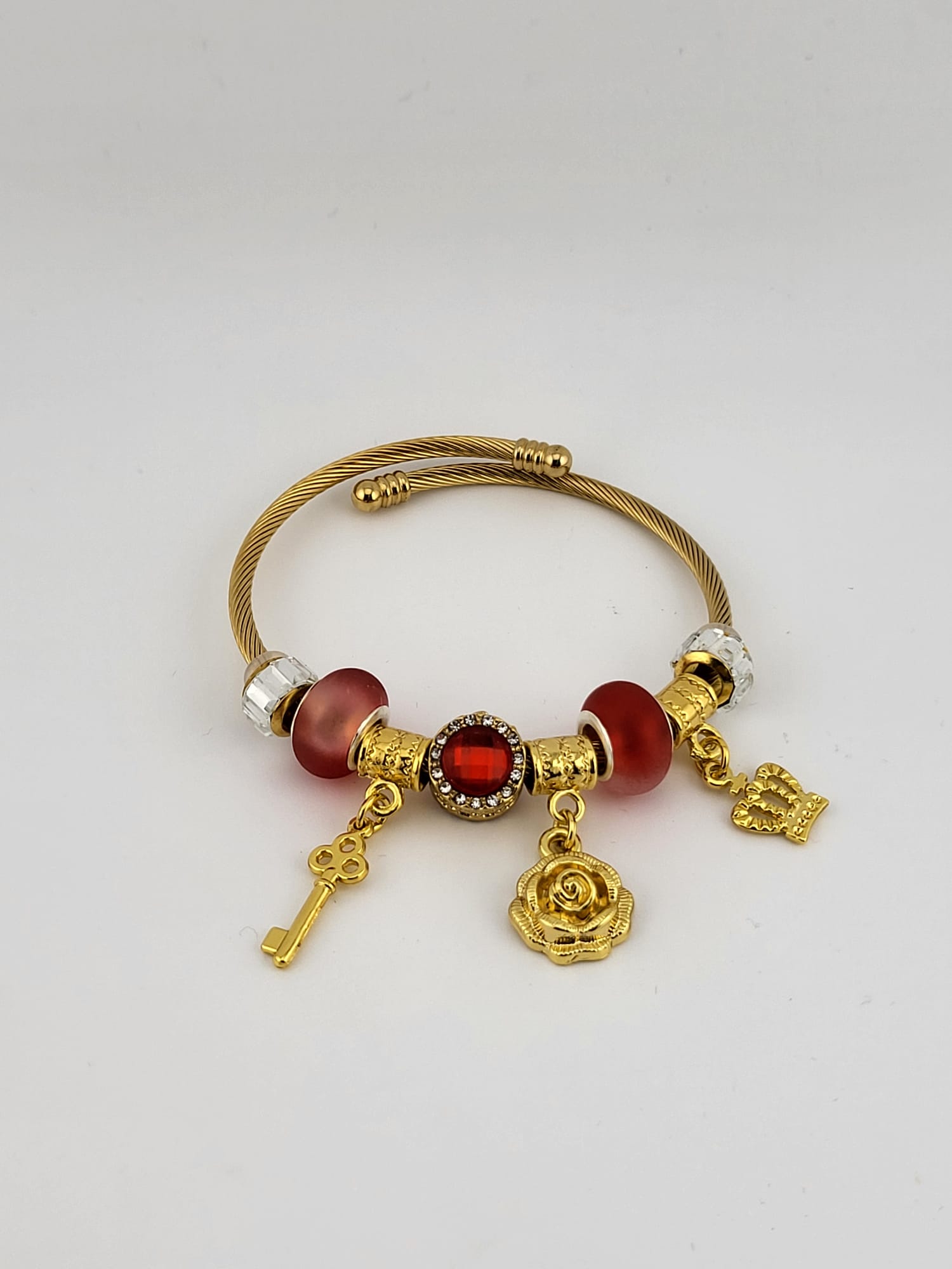 The Enchanted Elegance Bangle is a captivating open bangle adorned with three exquisite charms: a key, a rose, and a crown. Each charm is intricately designed to symbolize unlocking potential, timeless beauty, and regal confidence. Crafted with high-quality materials, this bangle adds a touch of sophistication to any outfit, making it perfect for both everyday wear and special occasions. Embrace the enchanting allure and meaningful symbolism of the Enchanted Elegance Bangle.