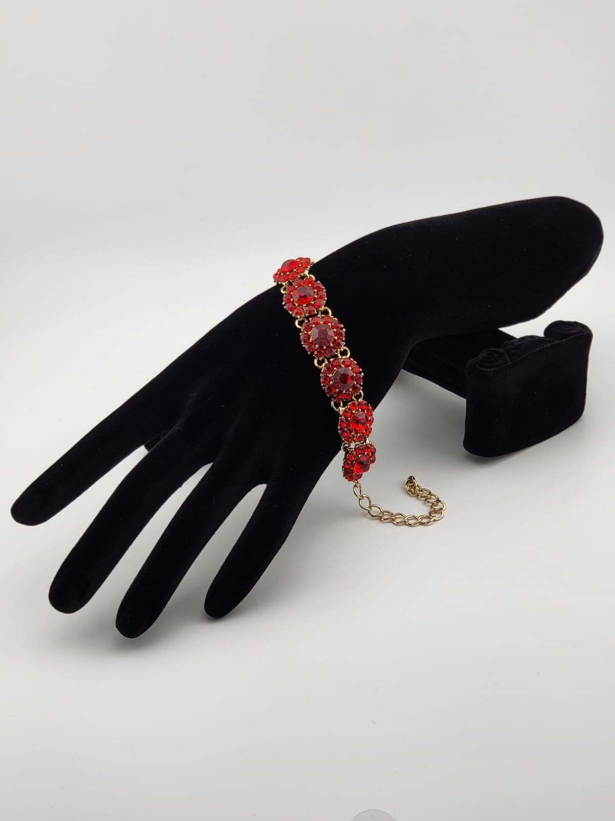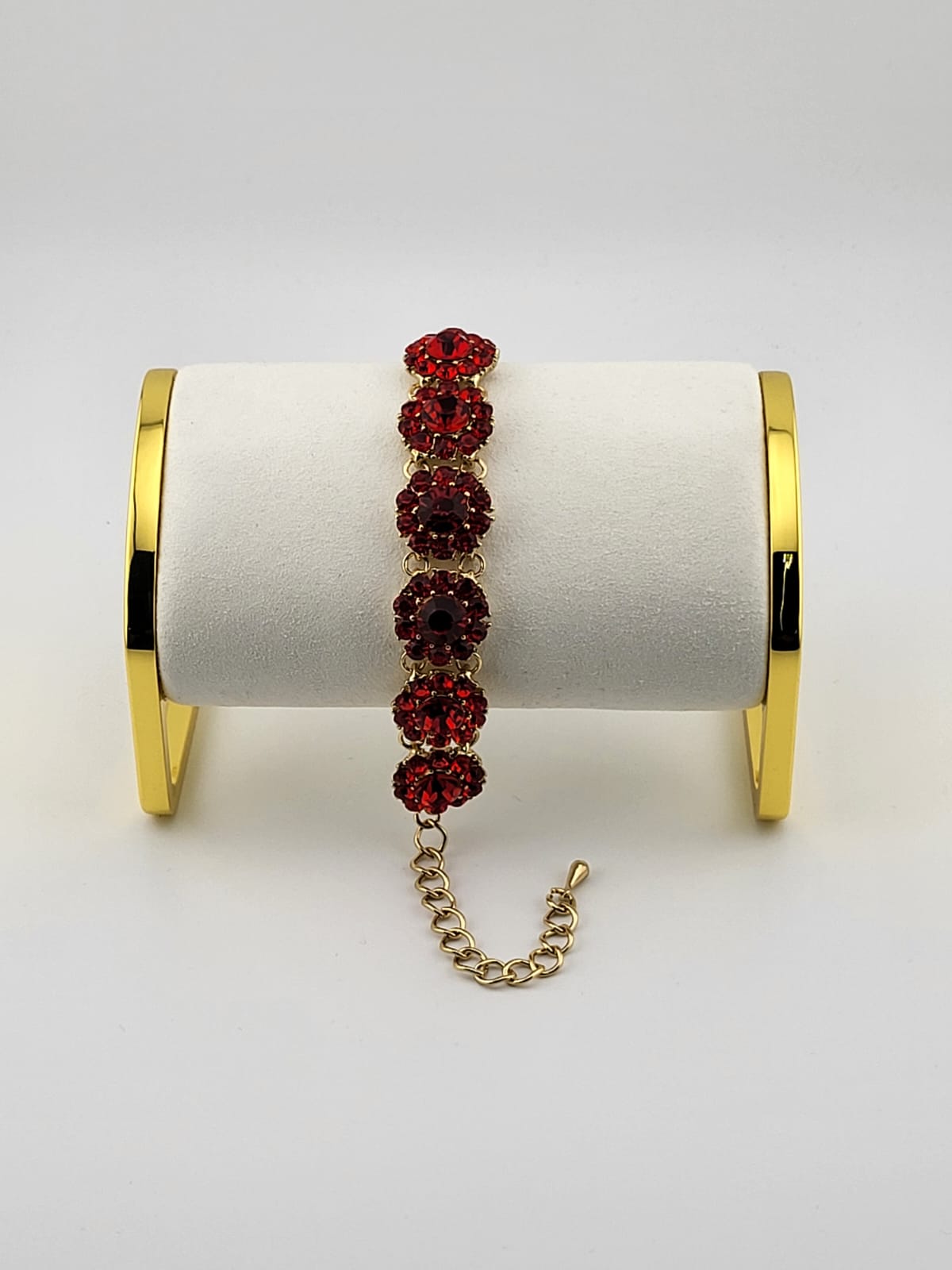Introducing our “Scarlet Blossom Gemstone Bracelet,” a captivating and elegant accessory designed to add a touch of glamour to any ensemble. Crafted with meticulous attention to detail, this bracelet features exquisite flower motifs adorned with vibrant red stones. Each stone is carefully chosen for its rich color and radiant sparkle, creating a stunning floral arrangement that exudes beauty and sophistication. The delicate design adds a feminine touch to any outfit, making it perfect for both casual and formal occasions. Whether worn as a statement piece or layered with other bracelets for a chic look, this bracelet is sure to become a cherished addition to your jewelry collection.