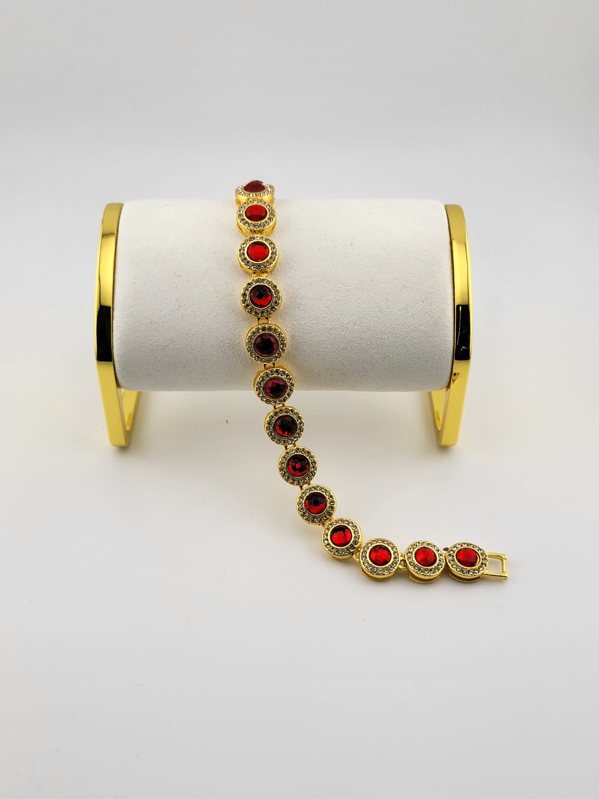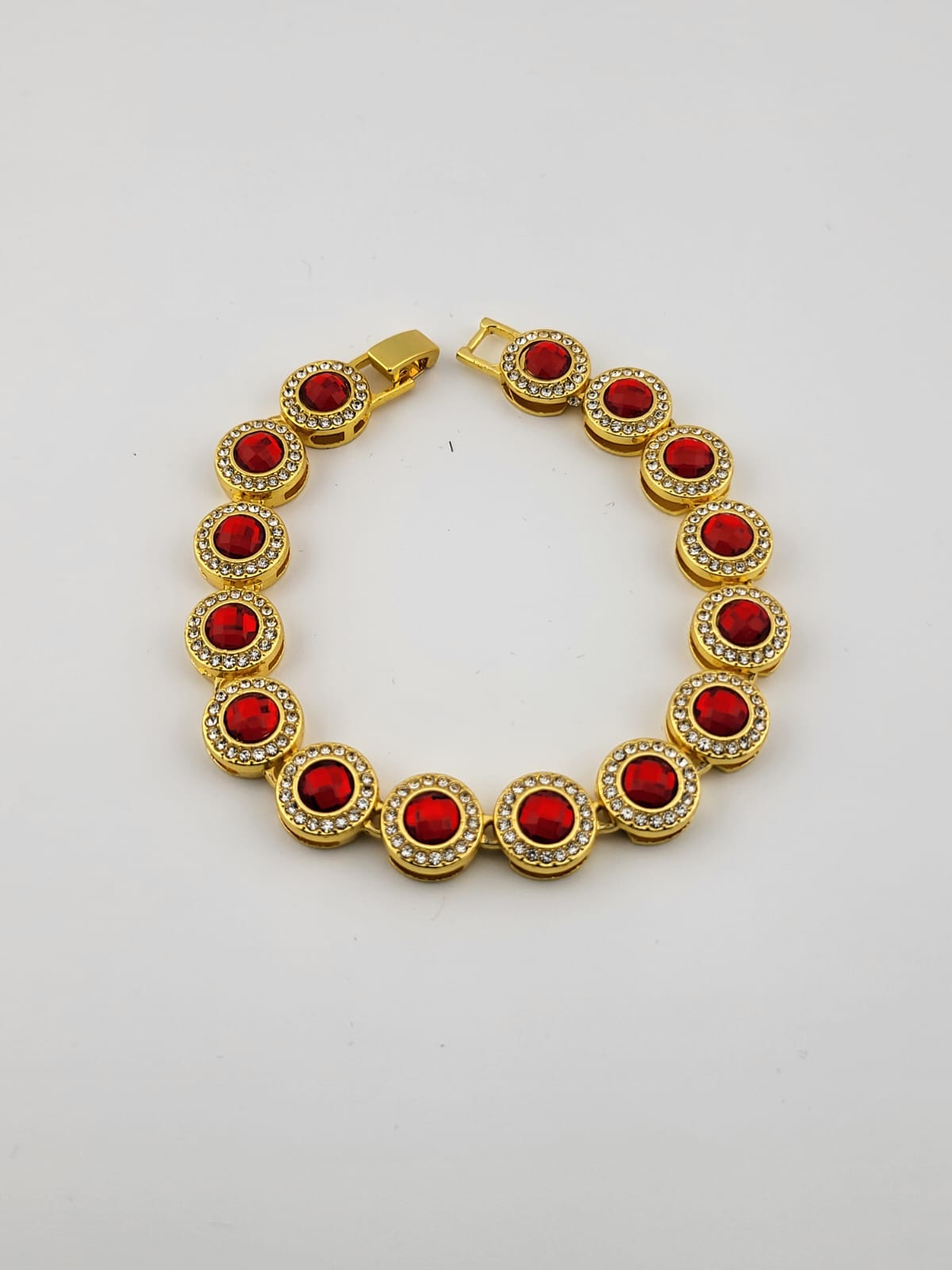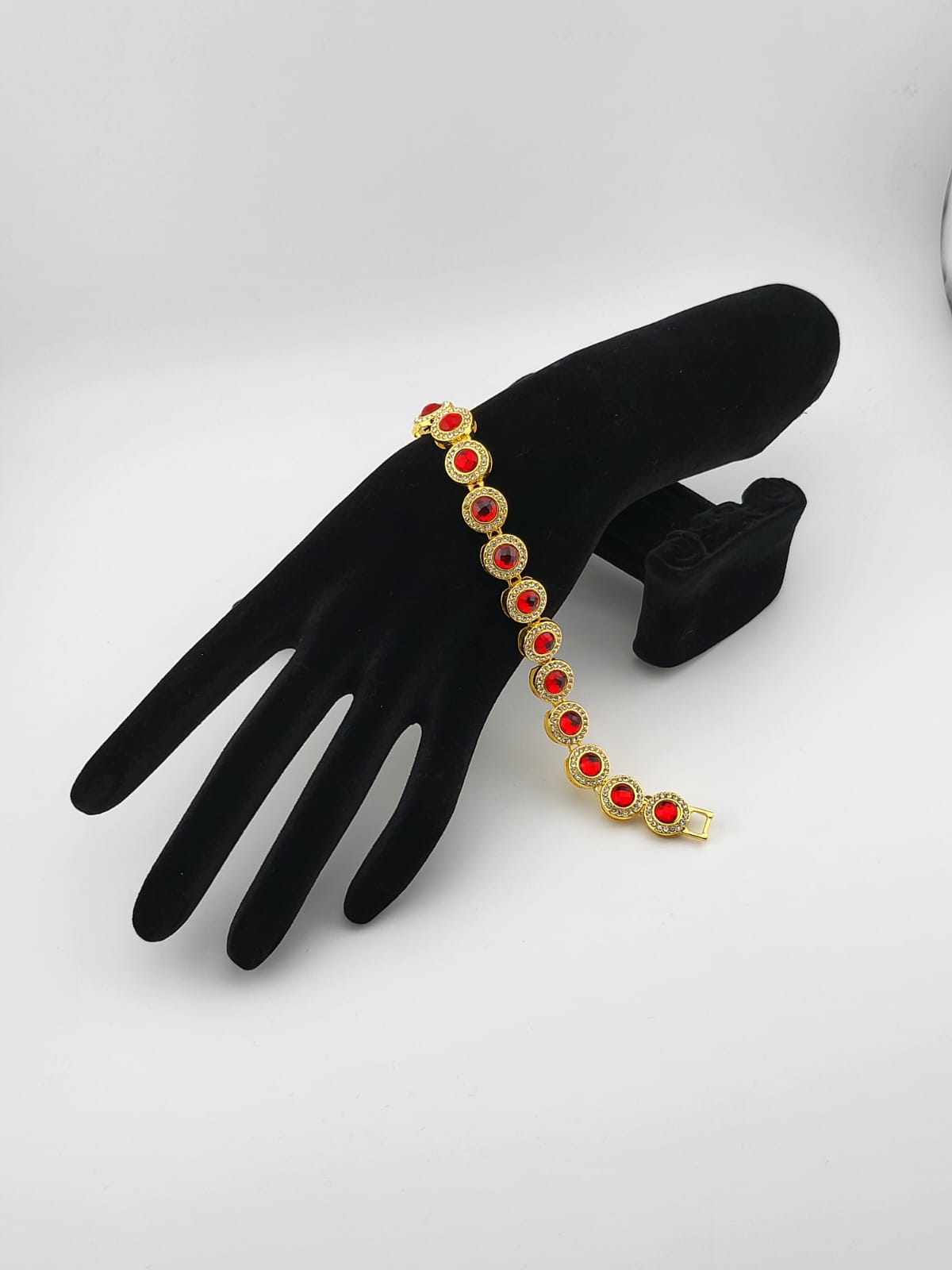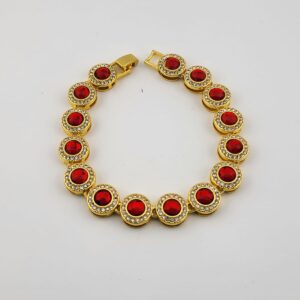 Introducing the Ruby Radiance Diamond-inspired Bracelet! This stunning piece features a brilliant red stone at its center, surrounded by sparkling faux diamonds. With its luxurious design and eye-catching appeal, this bracelet adds a touch of glamour to any outfit, making it the perfect accessory for special occasions or everyday wear.